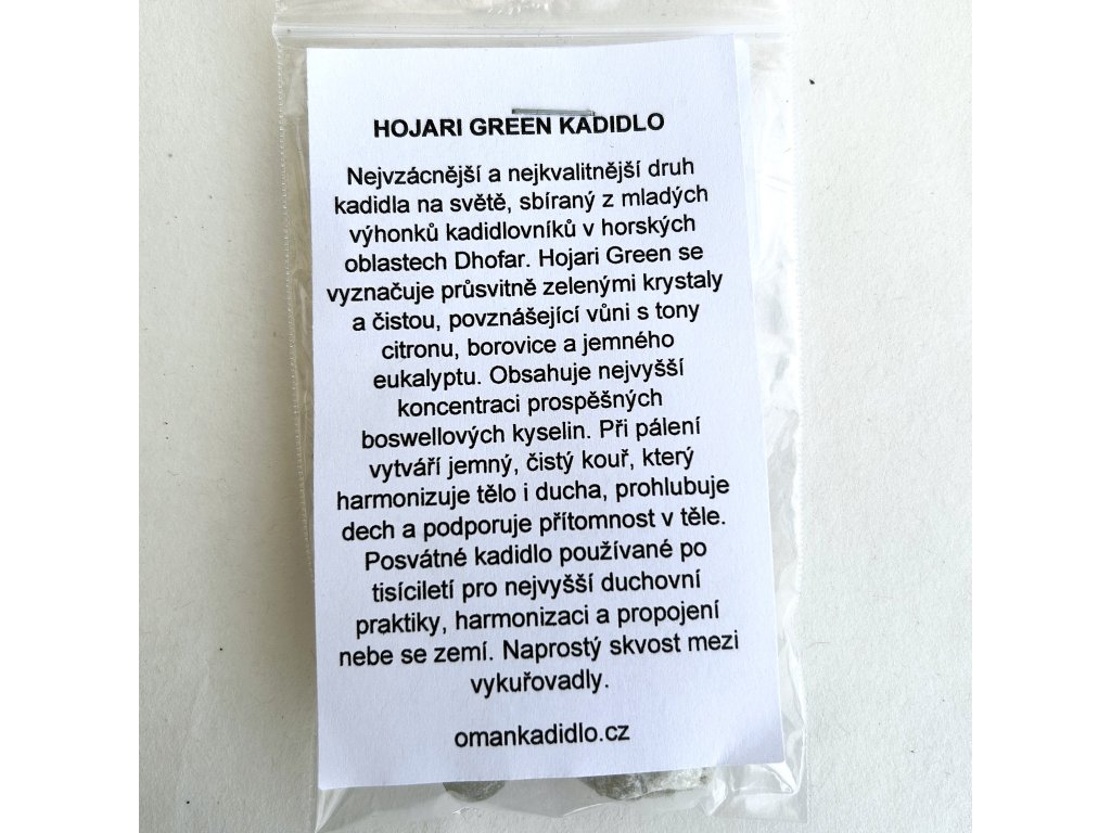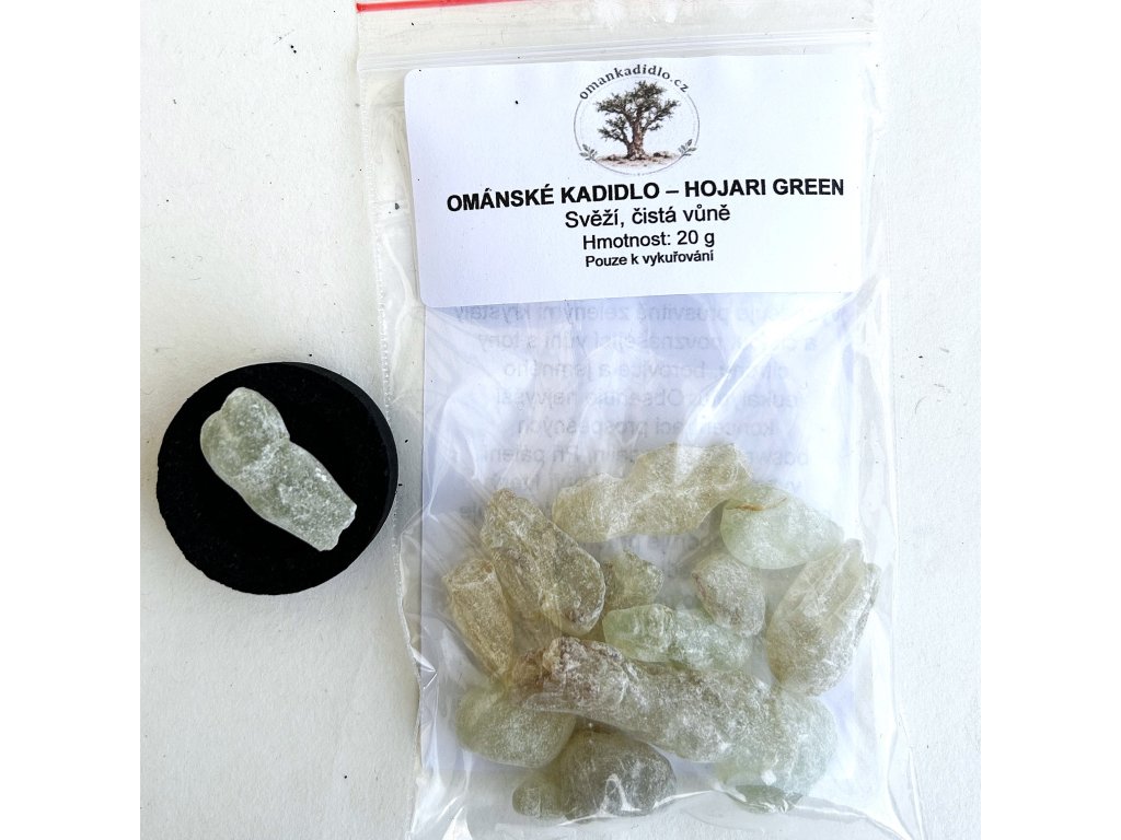 Patří mezi nejcennější a nejkvalitnější druhy kadidla na světě, sbírané z mladých výhonků kadidlovníků v horských oblastech Dhofaru. Hojari Green se vyznačuje průsvitně zelenými krystaly a čistou, povznášející vůní s tóny citronu, borovice a jemného eukalyptu. Je ceněné pro vysoký podíl boswellových kyselin. Při pálení vytváří jemný, čistý kouř, který harmonizuje tělo i ducha, prohlubuje dech a podporuje přítomnost v těle. Posvátné kadidlo používané po tisíciletí pro nejvyšší duchovní praktiky, harmonizaci a propojení nebe se zemí. Naprostý skvost mezi vykuřovadly.
